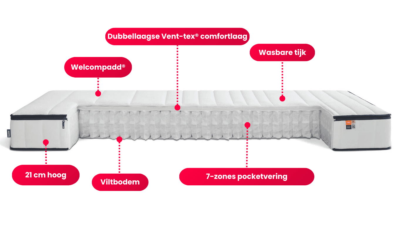 De kracht van het Auping Two matras zit in de dubbellaagse Vent-tex® afdeklaag. Deze innovatieve comfortlaag van elastisch polyester heeft een open structuur en zorgt voor een optimale ventilatie. Hierdoor blijf je de hele nacht koel en fris slapen. Bovenop ligt een zachte Welcompadd®-laag, die een extra gevoel van zachtheid en luxe toevoegt. De hoes (tijk) is afritsbaar en wasbaar op 60 °C, waardoor je matras eenvoudig schoon en hygiënisch blijft.