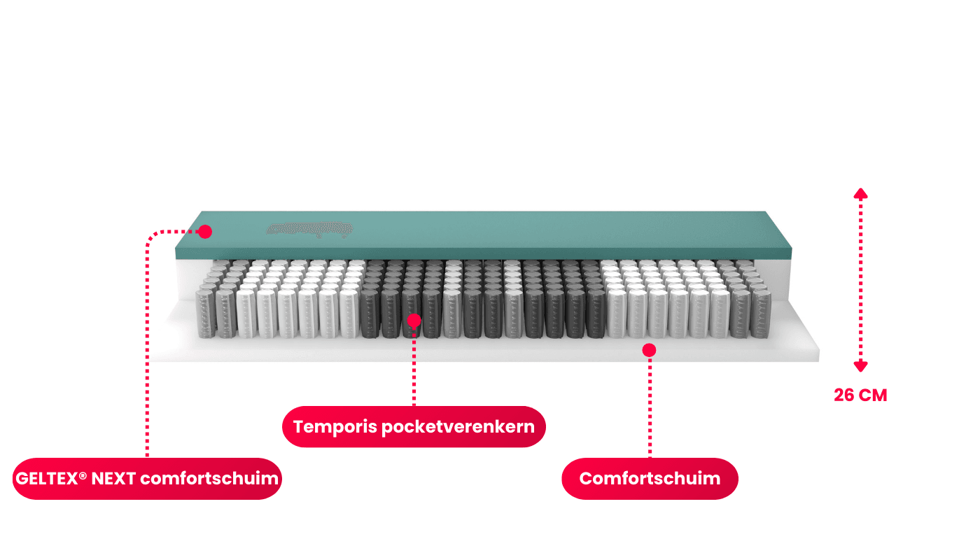 Met een 4 cm GELTEX® Comfort Foam en een Temporis pocketverenkern van 14 cm, die zorgvuldig is opgebouwd met 270 veren per vierkante meter, vind je de perfecte balans tussen ondersteuning en zachtheid. De slimme 7 ergonomische comfortzones passen zich aan jouw lichaam aan, terwijl het afritsbare bovenplateau van 100% polyester, wasbaar op 40°, voor gemak en hygiëne zorgt.