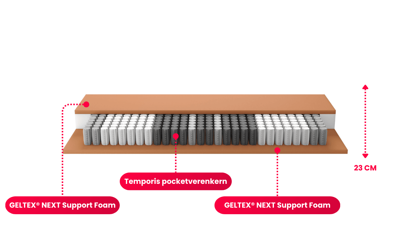Een kern bestaande uit individueel verpakte pocketveren, ontworpen om gerichte ondersteuning te bieden. Temporis pocketvering reageert goed op lichaamsbewegingen en zorgt voor een goede gewichtsverdeling.