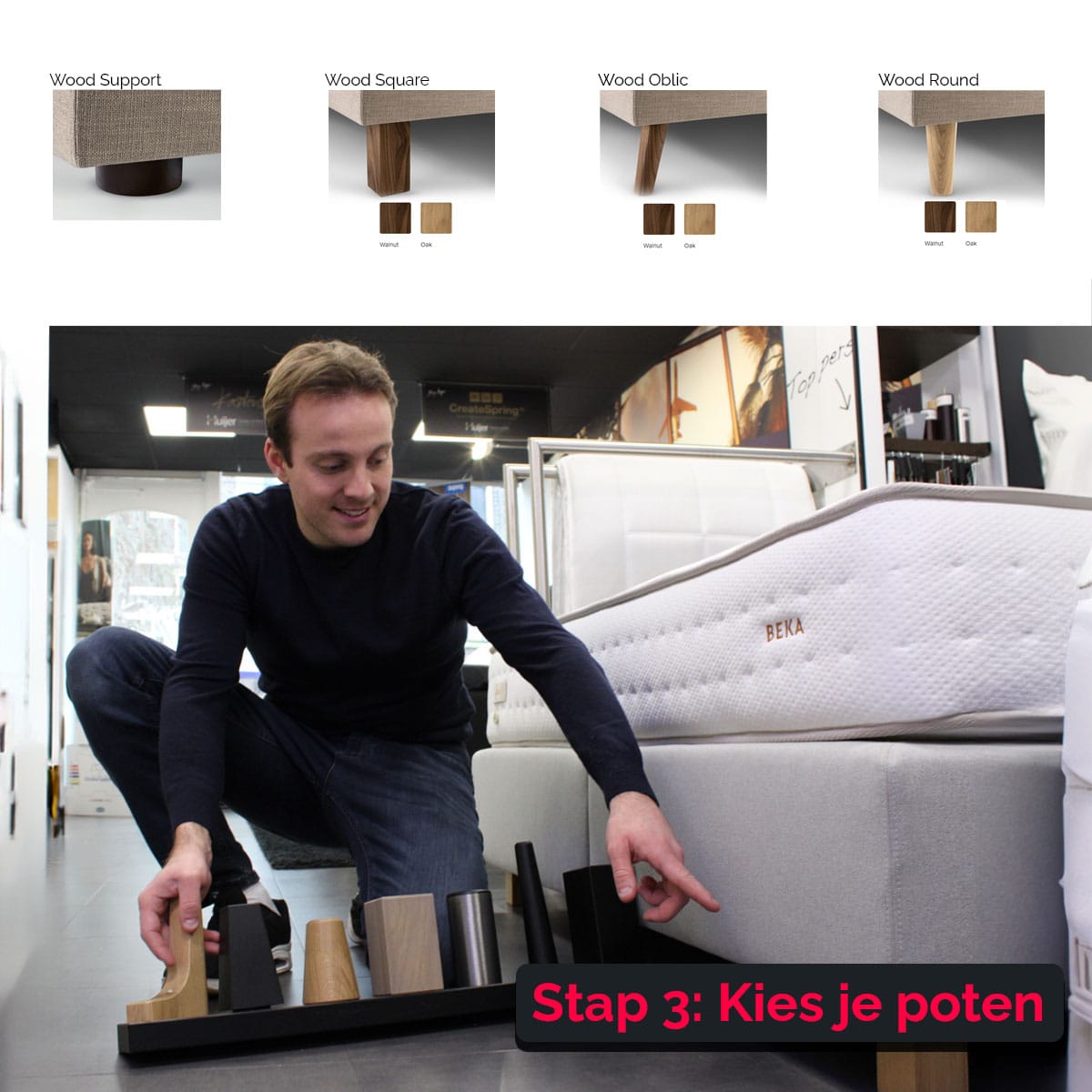Stap 4 – Kies je poten: kies de poten die het beste passen bij jouw voorkeuren en stijl, waardoor je het bed helemaal naar jouw wens samenstelt.