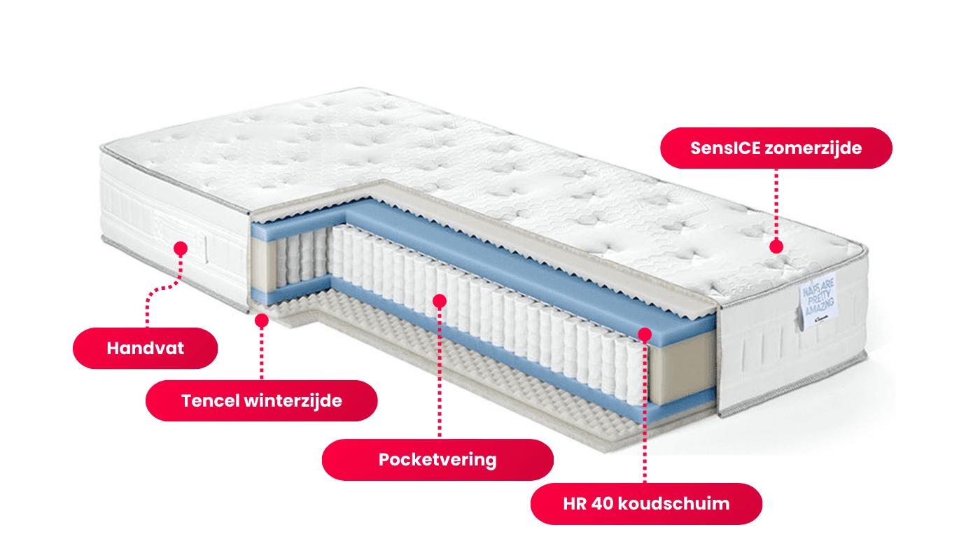 De zomerzijde van het matras is voorzien van SensICE-technologie, die zorgt voor een verkoelend effect en optimale vochtregulatie tijdens warme nachten.