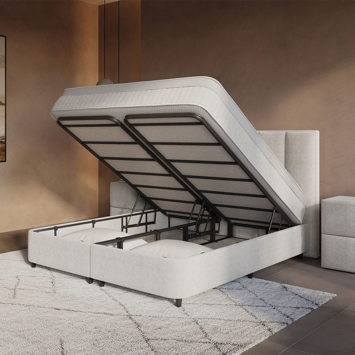 Onder de boxspring bevindt zich een ruime opbergruimte over de volledige lengte. Deze open je eenvoudig via de voorkant met behulp van vier voorgemonteerde gasveren (1000N per stuk). Het metalen frame, gelegeerd met carbon, biedt maximale stevigheid, terwijl de binnenzijde is afgewerkt met gefineerd plaatmateriaal voor een duurzame afwerking. Dankzij de beveiliging en praktische handgrepen is het openen en sluiten licht en veilig. De zwarte kunststof poten van 12 cm geven de Linea bovendien een moderne, zwevende uitstraling.