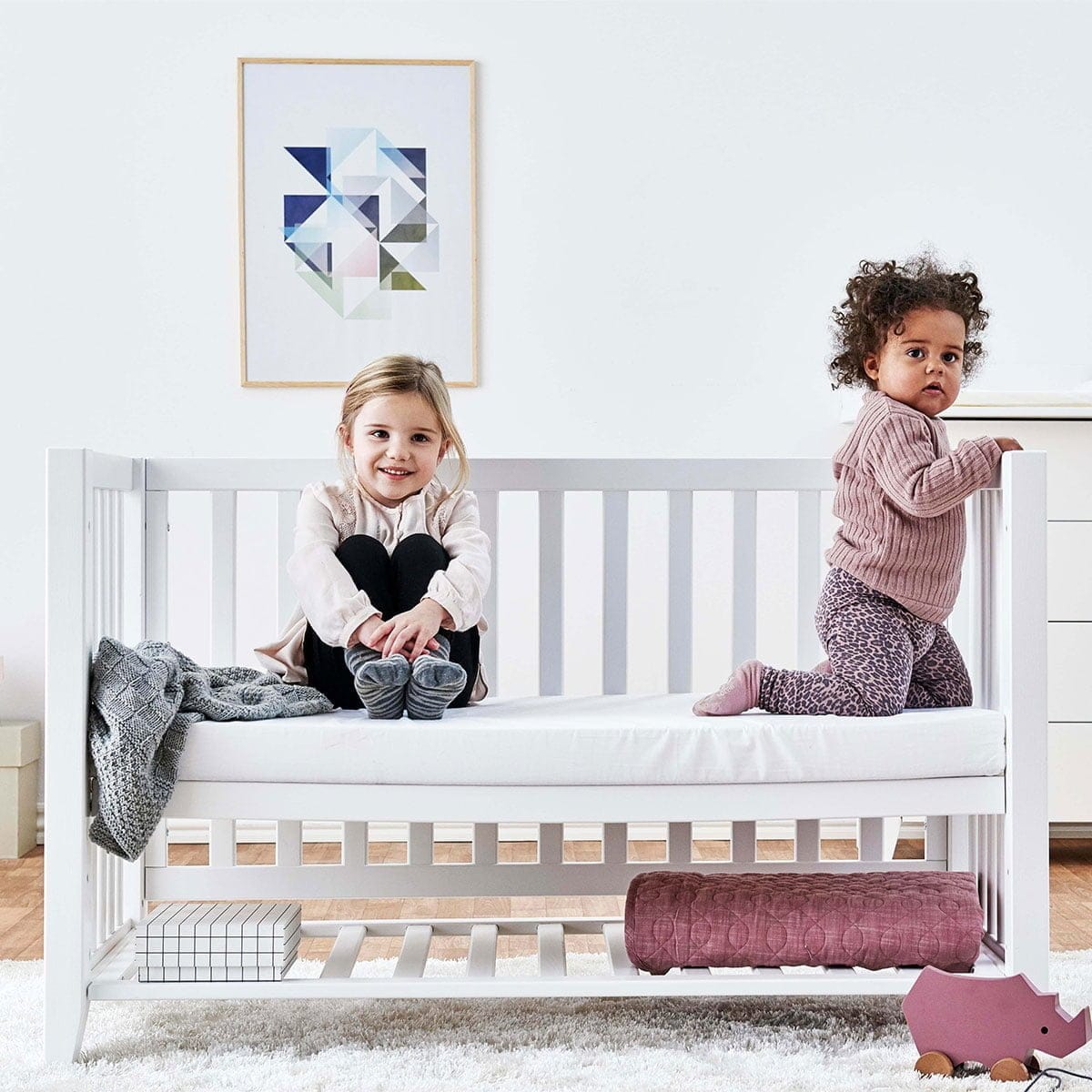 De bodem kan op twee verschillende hoogtes worden ingesteld: 19,3 cm boven de vloer, om te voorkomen dat oudere kinderen uit bed vallen, en 38,5 cm boven de vloer, wat het gemakkelijker maakt om een baby op te tillen.