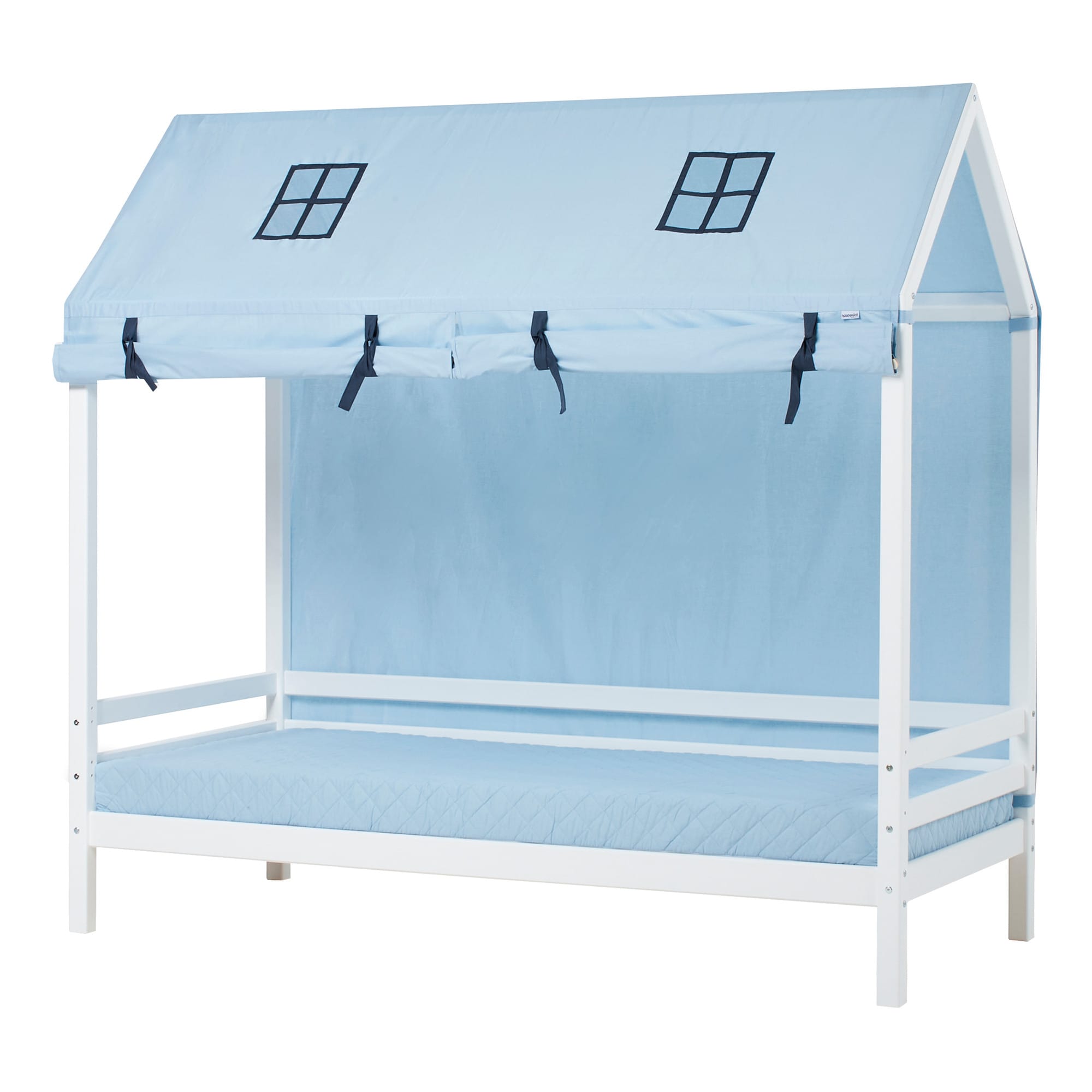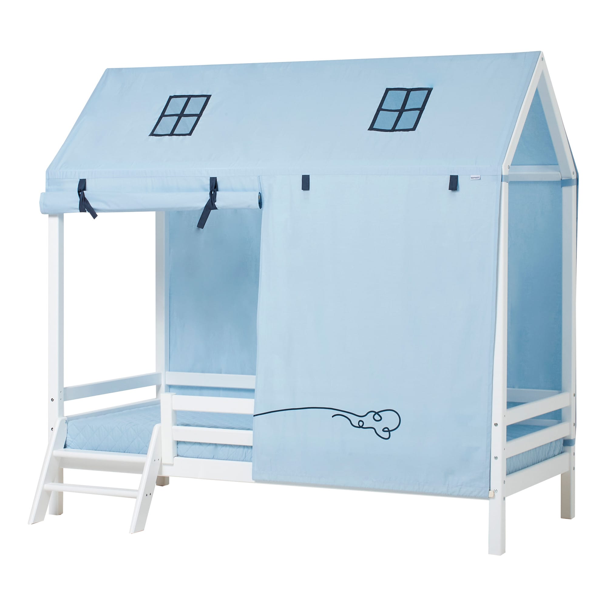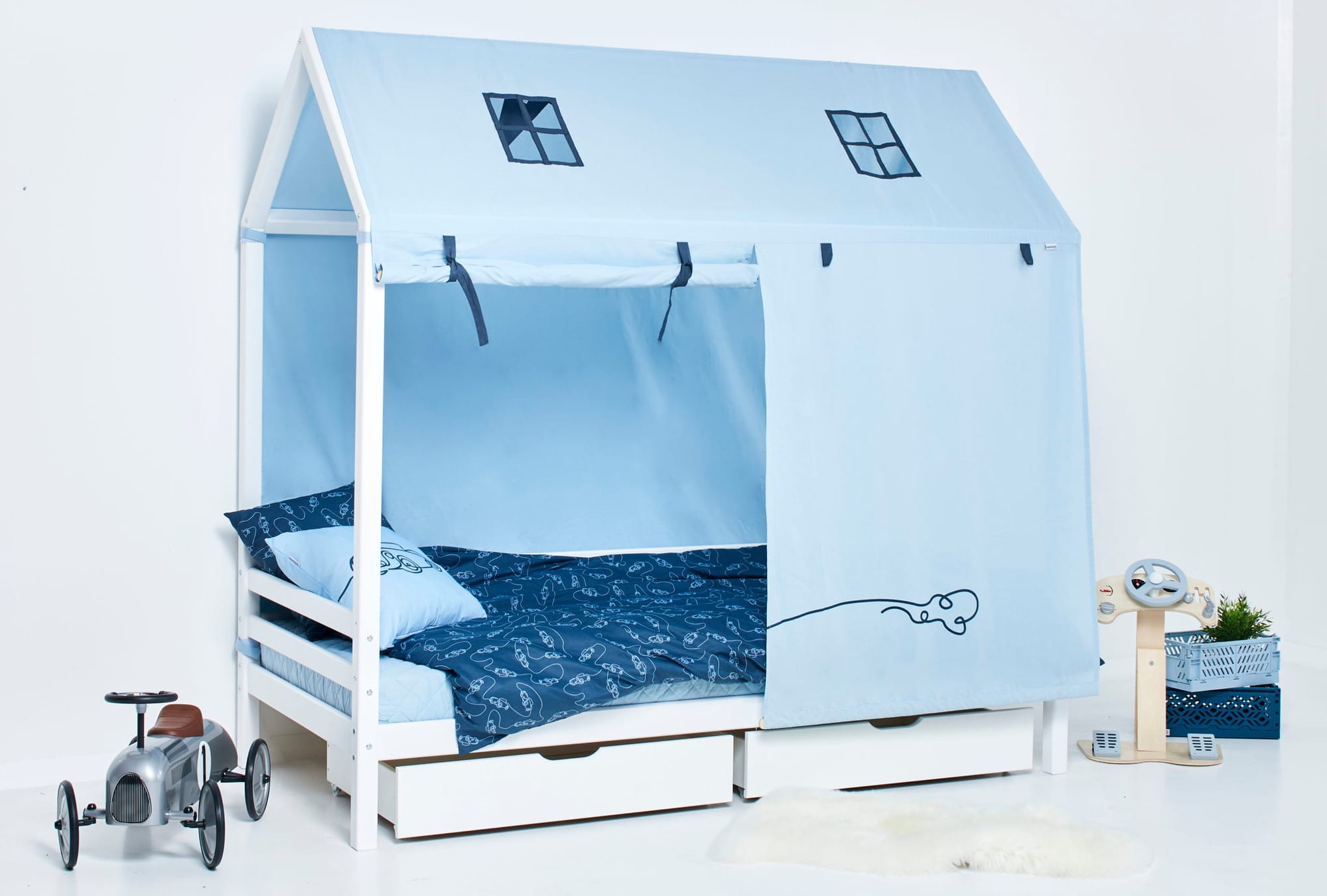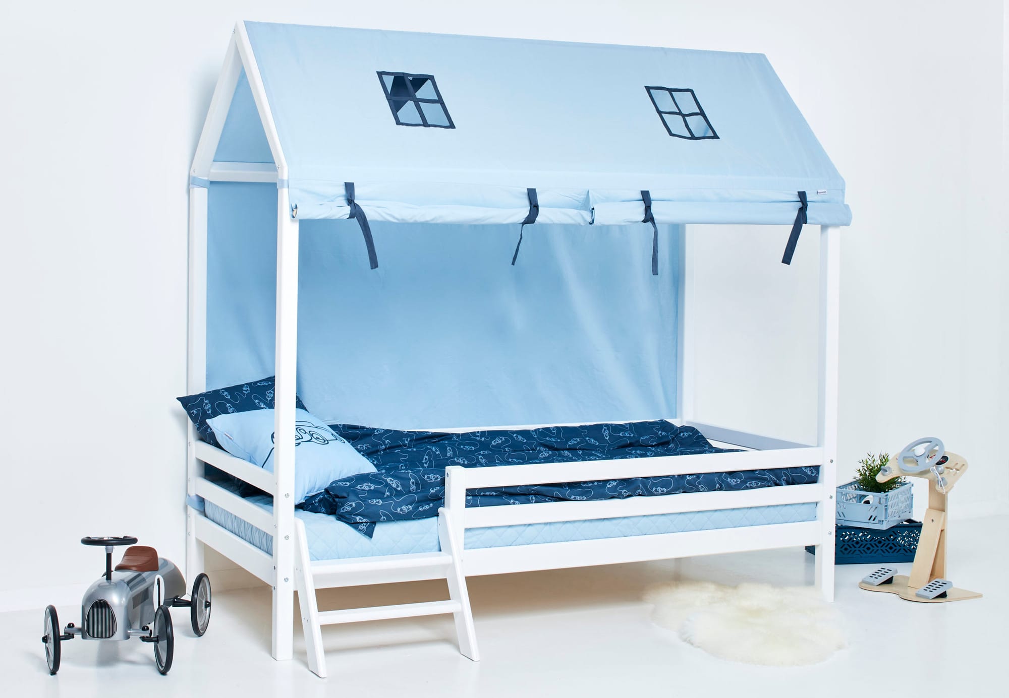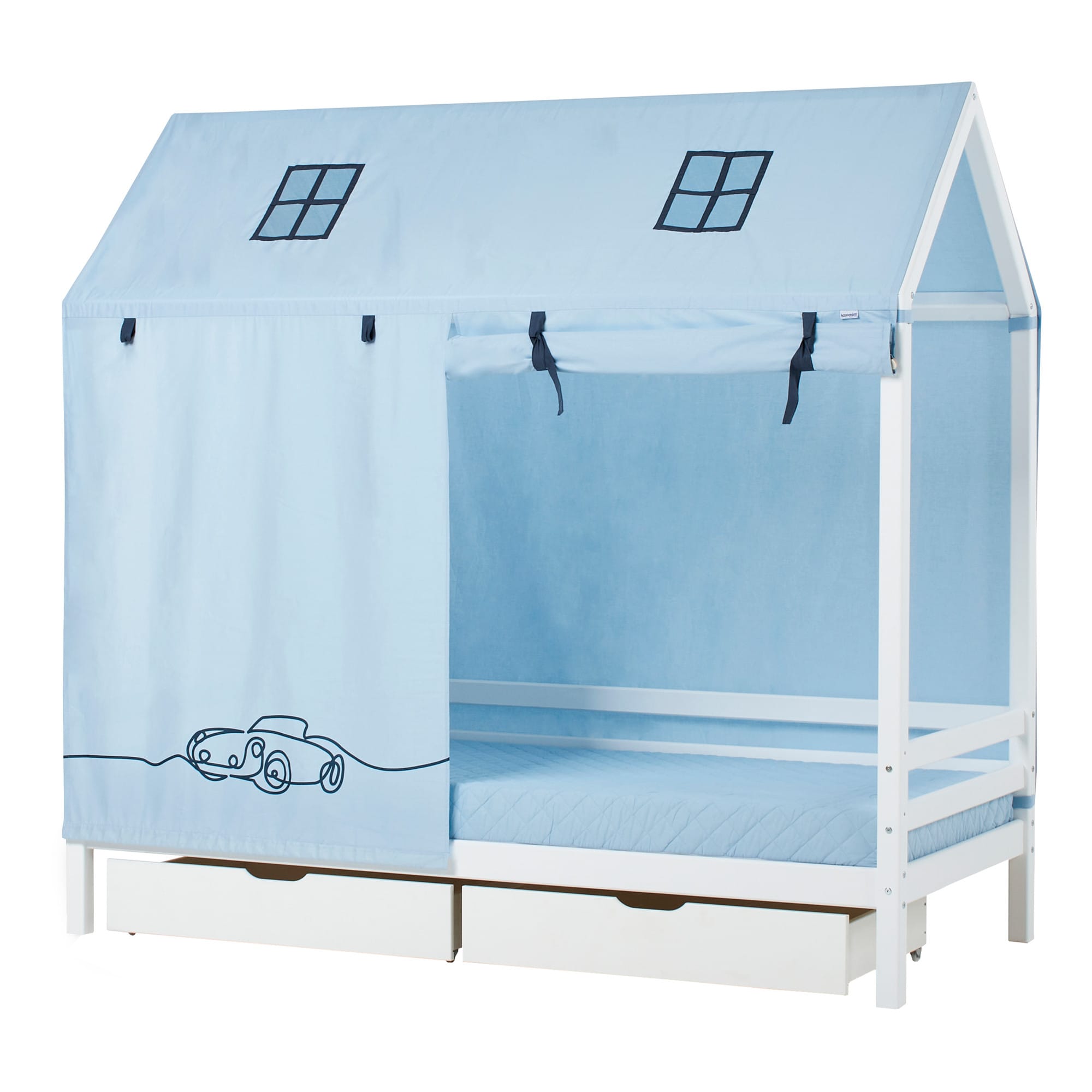Het Hoppekids ECO Dream Cars bedhuis bedgordijn is een prachtige aanvulling voor de huisbedden, verkrijgbaar in de maten 70×160 cm en 90×200 cm. Het beddengoed verandert de bedden in een geweldig speel- en rustgebied. Het wordt eenvoudig bevestigd aan het huisbed met de klittenbandstrips en kan gemakkelijk worden verwijderd. De voorkant van het beddengoed is verdeeld zodat één of beide zijden geopend kunnen worden. De lusjes houden het stof element veilig op zijn plaats wanneer het opgerold is. De achterkant is volledig gesloten. Twee loggen voor het verzwaren van de voorkant zijn inbegrepen.