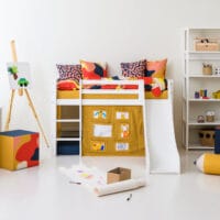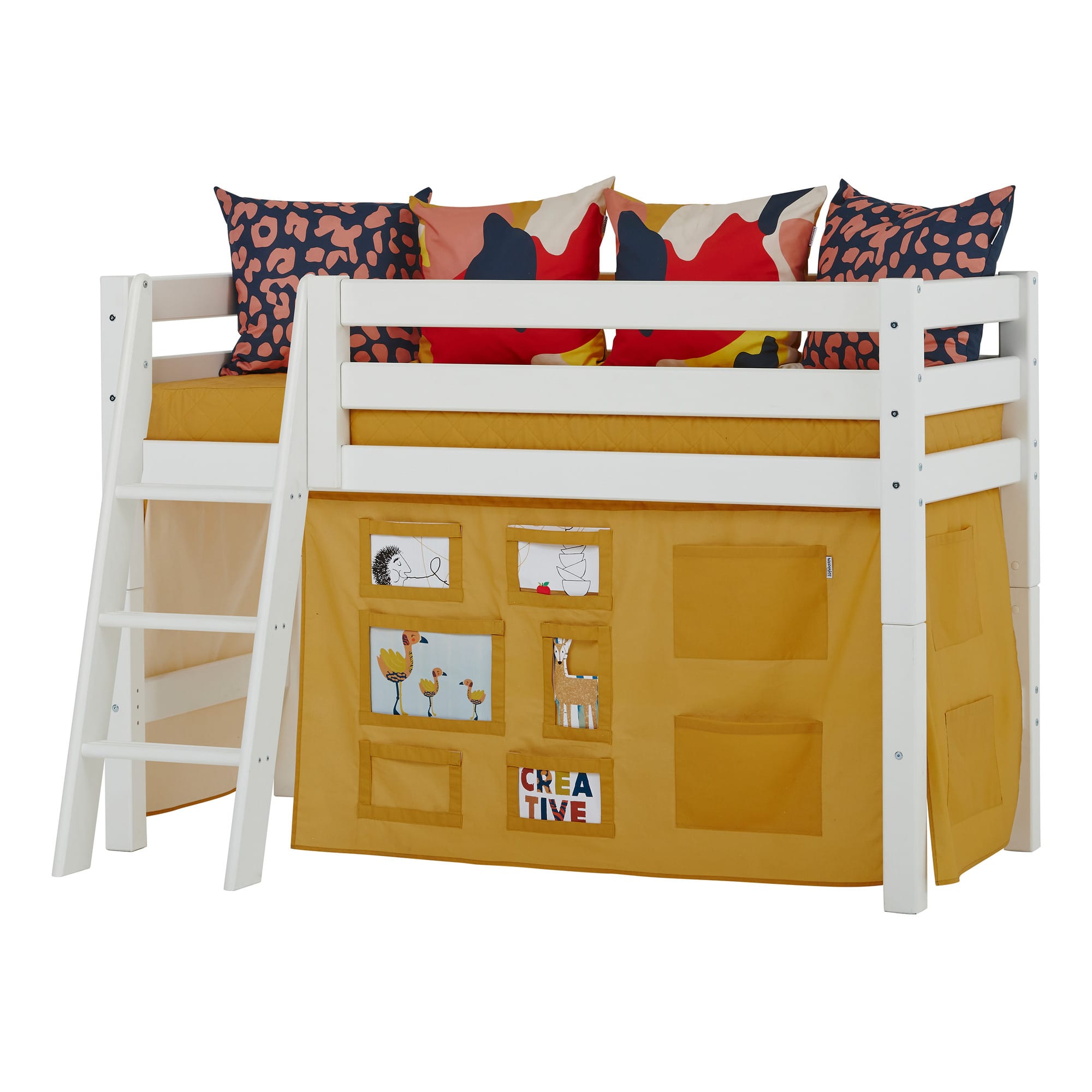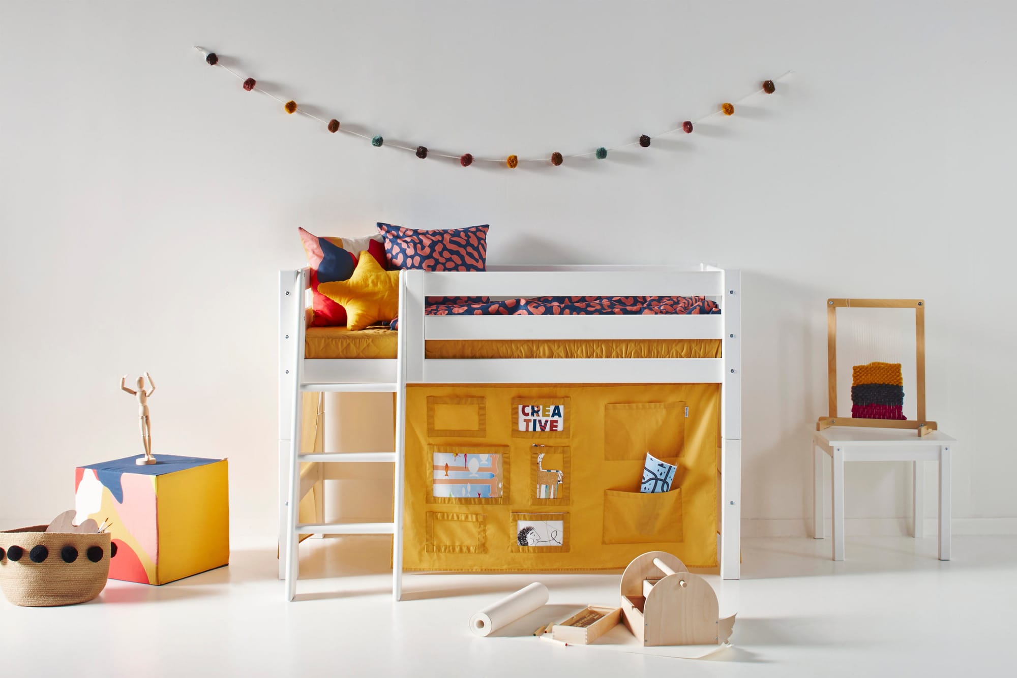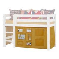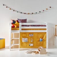 Het Hoppekids Creator Geel Bedgordijn creëert een vrolijke en zonnige wereld onder het bed! Dit gordijn maakt van het bed niet alleen een comfortabele slaapplek, maar ook een plek waar fantasie tot leven komt. Het gordijn vormt een gezellige schuilplaats onder het bed, ideaal voor speeltijd, knutselprojecten of om je even terug te trekken. De ruimte onder de middelhoogslapers kan eenvoudig worden ingericht met zachte matrassen, kleurrijke kussens, slingers en sfeervolle LED-verlichting.