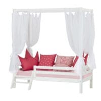 Het prachtige ECO Dream hemelbed is beschikbaar in twee afmetingen: 70 x 160 cm en 90 x 200 cm, en wordt geleverd met een handig trappetje en volledige uitvalbeveiliging. Hierdoor kan jouw kindje niet uit het bed vallen en ben je verzekerd van een rustige nacht.