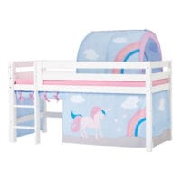 Voeg een vleugje magie en speelsheid toe aan de kinderkamer met deze Play & Bed Tunnel uit het Unicorn Universum van Hoppekids. Dit schattige tunnelholletje met een mooi eenhoornprint maakt het eenvoudig om een knus hoekje te creëren om te lezen, te spelen of even te ontspannen. De zachte geborduurde bodem biedt comfort en maakt dit tunnelholletje nóg gezelliger als je er extra kussens of dekentjes aan toevoegt.