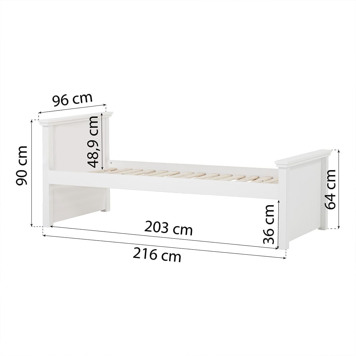 - Afmetingen bed 90×200 cm: 216 x 96 x 90 cm (L x B x H).