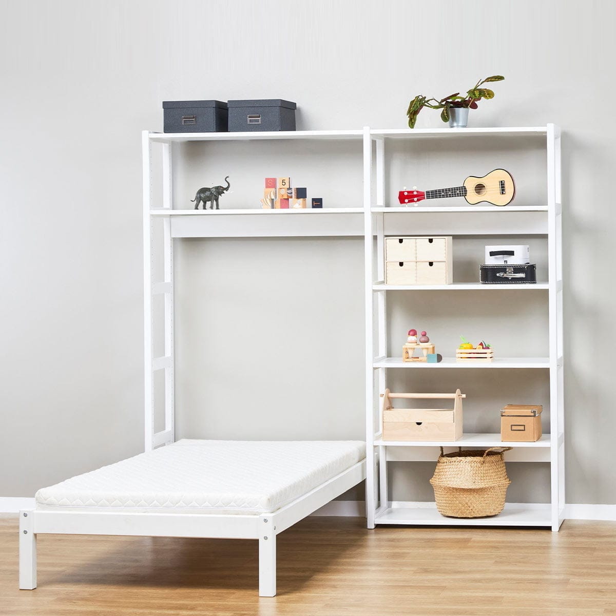Het STOREY opbergsysteem van Hoppekids combineert een bed van 70×160 cm met acht handige legplanken. De planken zijn aanpasbaar en kunnen in verschillende configuraties worden geplaatst. Het bed biedt extra opbergruimte met handige lades op wieltjes.