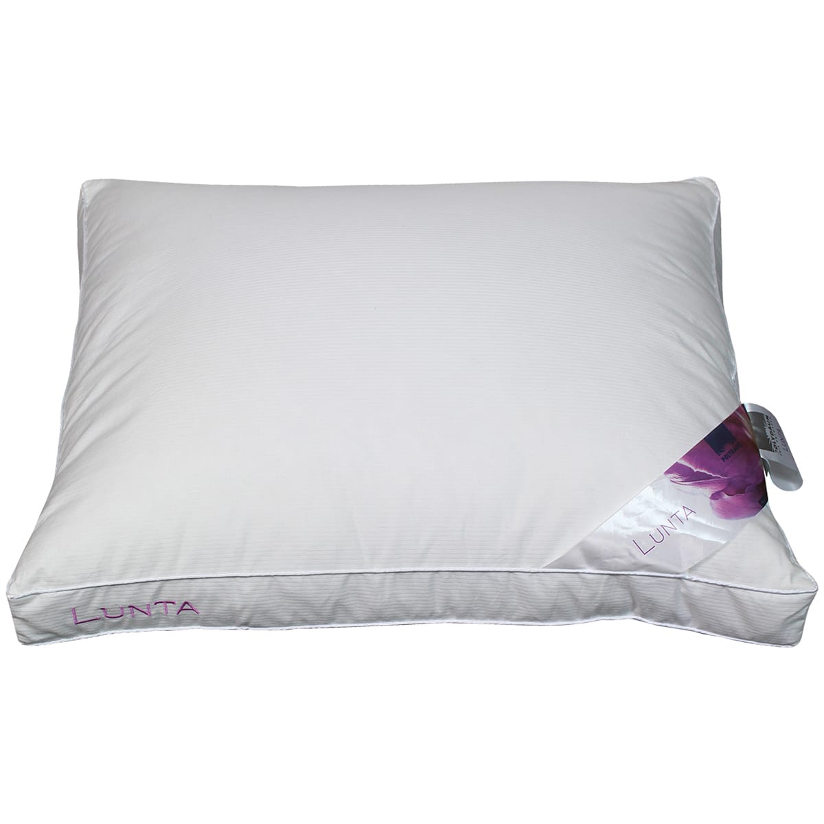 Het Lunta hoofdkussen heeft een ergonomische boxvorm met een opstaande rand die oploopt van 5 tot 10 centimeter. Hierdoor is het aan twee zijden te gebruiken: de lage kant biedt subtiele ondersteuning voor buikslapers, terwijl de hogere kant perfect is voor rug- en zijslapers. Zo kun je het kussen eenvoudig aanpassen aan jouw favoriete slaaphouding.