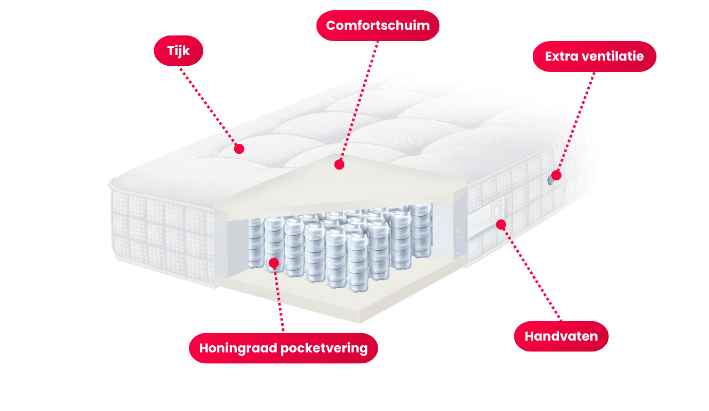 De 7-gezoneerde honingraat pocketvering zorgt voor optimale ondersteuning op de juiste plaatsen van het lichaam en voor aangename ventilatie.