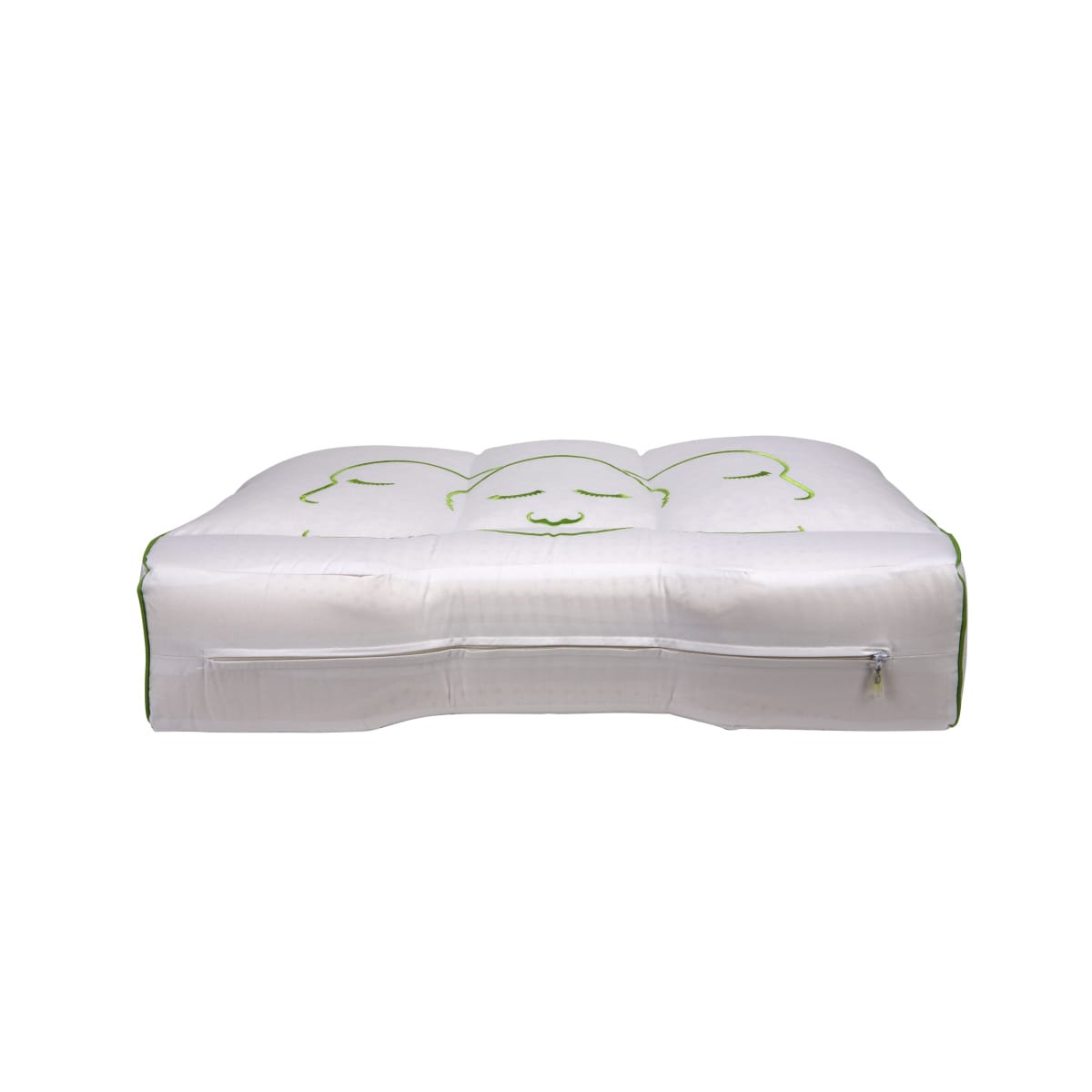 De bovenvakken van het kussen zijn gevuld met Vita Talalay® latex-sticks – een duurzame, hoogwaardige latex die bekendstaat om haar soepelheid, ventilatievermogen en vochtregulatie. De neksteun is eveneens vervaardigd uit Vita Talalay® latex, die soepeler en beter ademend is dan gewone latex. De nekinkeping zorgt ervoor dat het hoofd en de nek perfect aansluiten, waardoor de nekwervels ontspannen blijven liggen en de schouders goed worden ondersteund.