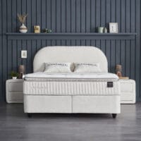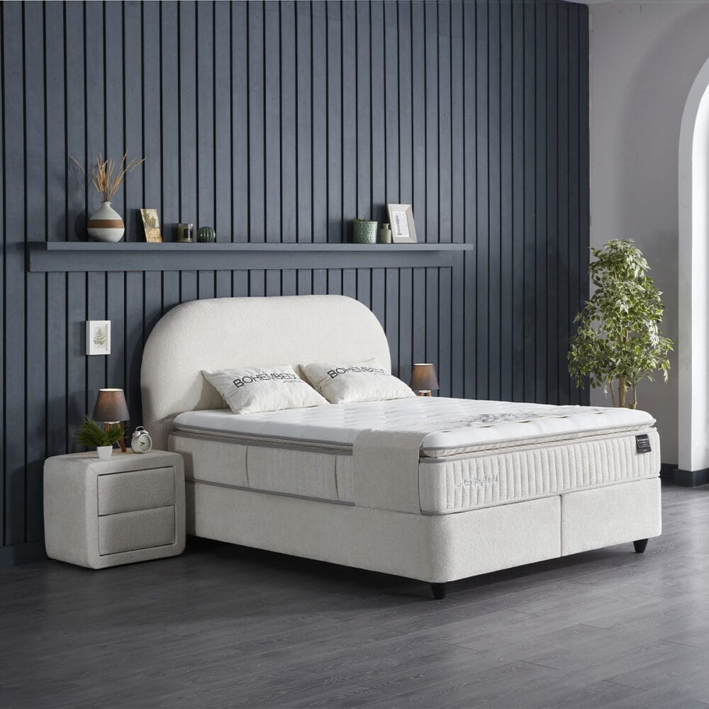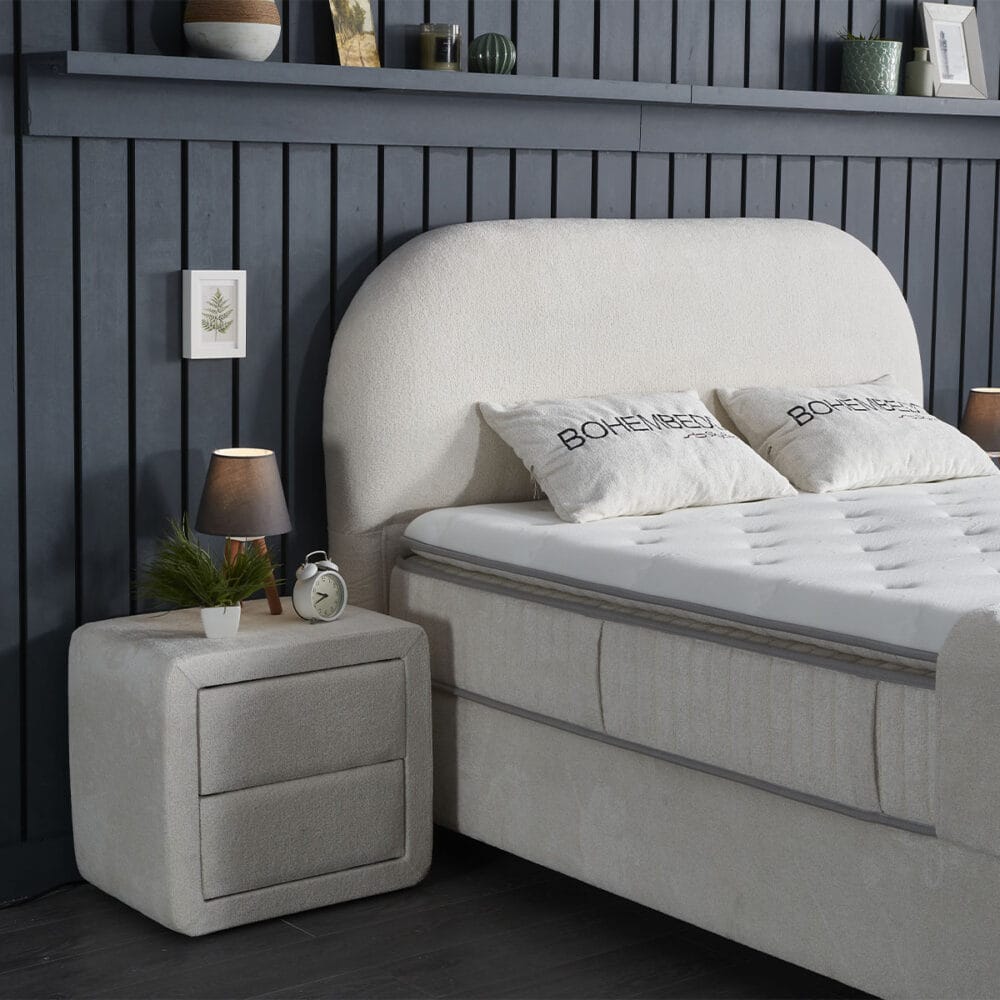 De Skybedd Bohembedd combineert zachte vormen met slimme functionaliteit in een verfijnde Japandi-stijl. Het afgeronde hoofdbord, de warme bouclé-bekleding en de verborgen opbergruimte maken dit bed tot een stijlvolle en praktische toevoeging aan elke slaapkamer. Verkrijgbaar in 140×200, 160×200 en 180×200 cm.