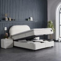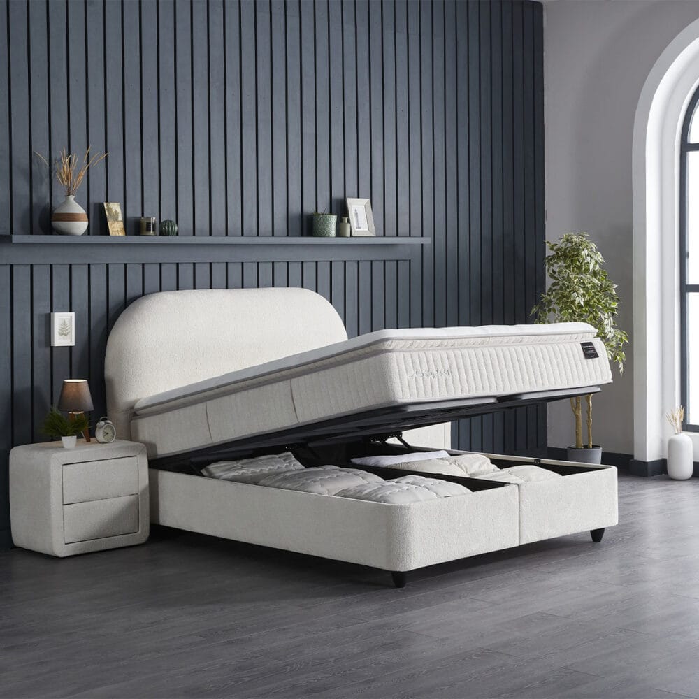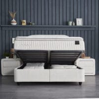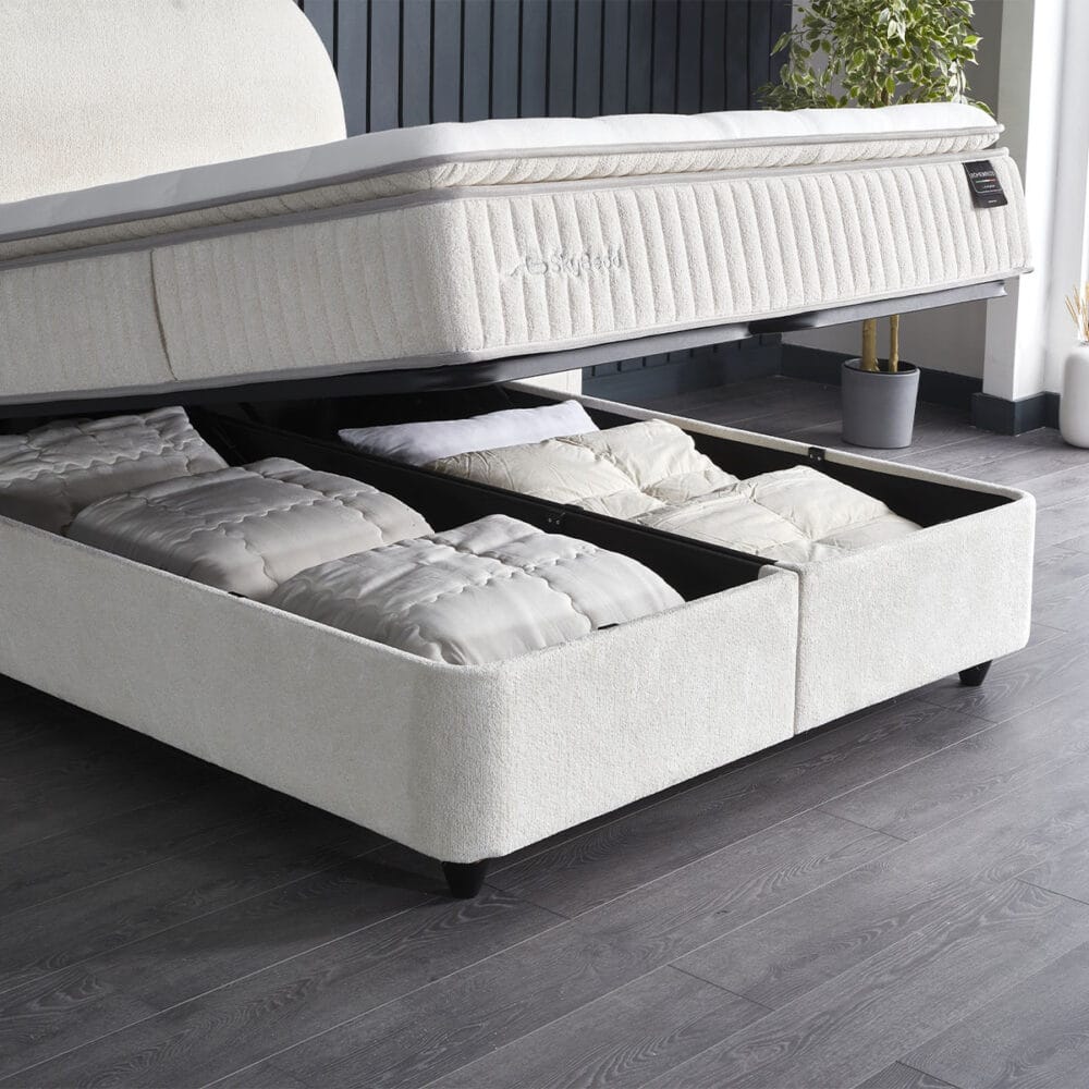 Onder het matras bevindt zich een ruime opbergbox, toegankelijk via de voorzijde. Vier voorgemonteerde gasveren van elk 9000 newton maken het openen licht en stabiel. Twee transparante designhandvaten zorgen voor een strakke afwerking. De opbergruimte verschilt per formaat: