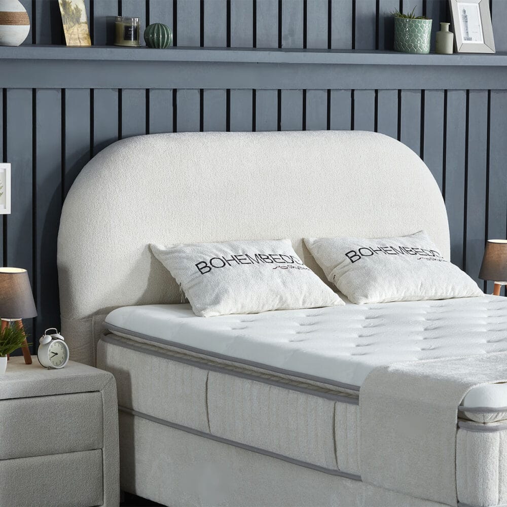 Het zacht afgeronde hoofdbord geeft de Bohembedd een rustige uitstraling met subtiele lijnen. De beige bouclé-bekleding sluit perfect aan bij het minimalistische karakter van de Japandi-stijl. Het hoofdbord is 127 cm hoog en 10 cm dik, en past zich in breedte aan het bedformaat aan: