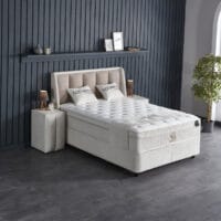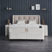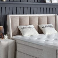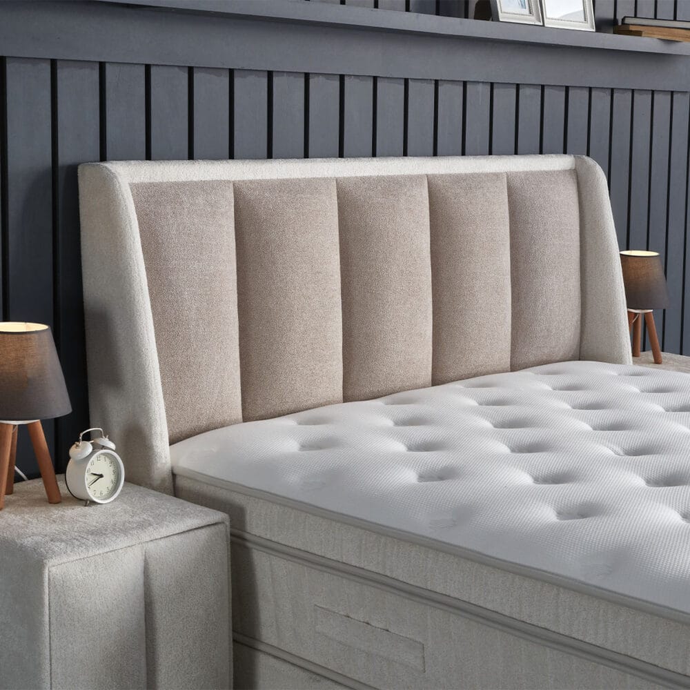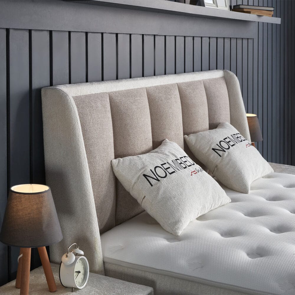 De Noemibedd van Skybedd combineert strak lijnenspel met zachte materialen en slimme functionaliteit. Het hoge hoofdbord met verticale stroken in een warme bouclé-stof straalt rust en eenvoud uit. Dankzij de comfortabele lighoogte van 70 cm en een volledig geïntegreerd opbergsysteem is deze boxspring zowel stijlvol als praktisch.