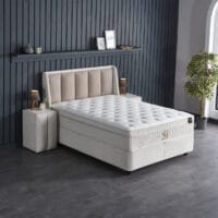 De Noemibedd is uitgerust met een 34 cm hoog hybride matras met pocketveren en 7 ergonomische comfortzones. De geïntegreerde topper van 8 cm HR50 koudschuim zorgt voor ondersteuning en drukverdeling. Dankzij de antislipbodem en matrasremmers aan de zijkant blijft alles netjes op zijn plaats. Het ligcomfort is medium tot stevig en geschikt voor alle slaaphoudingen: zij, buik en rug.