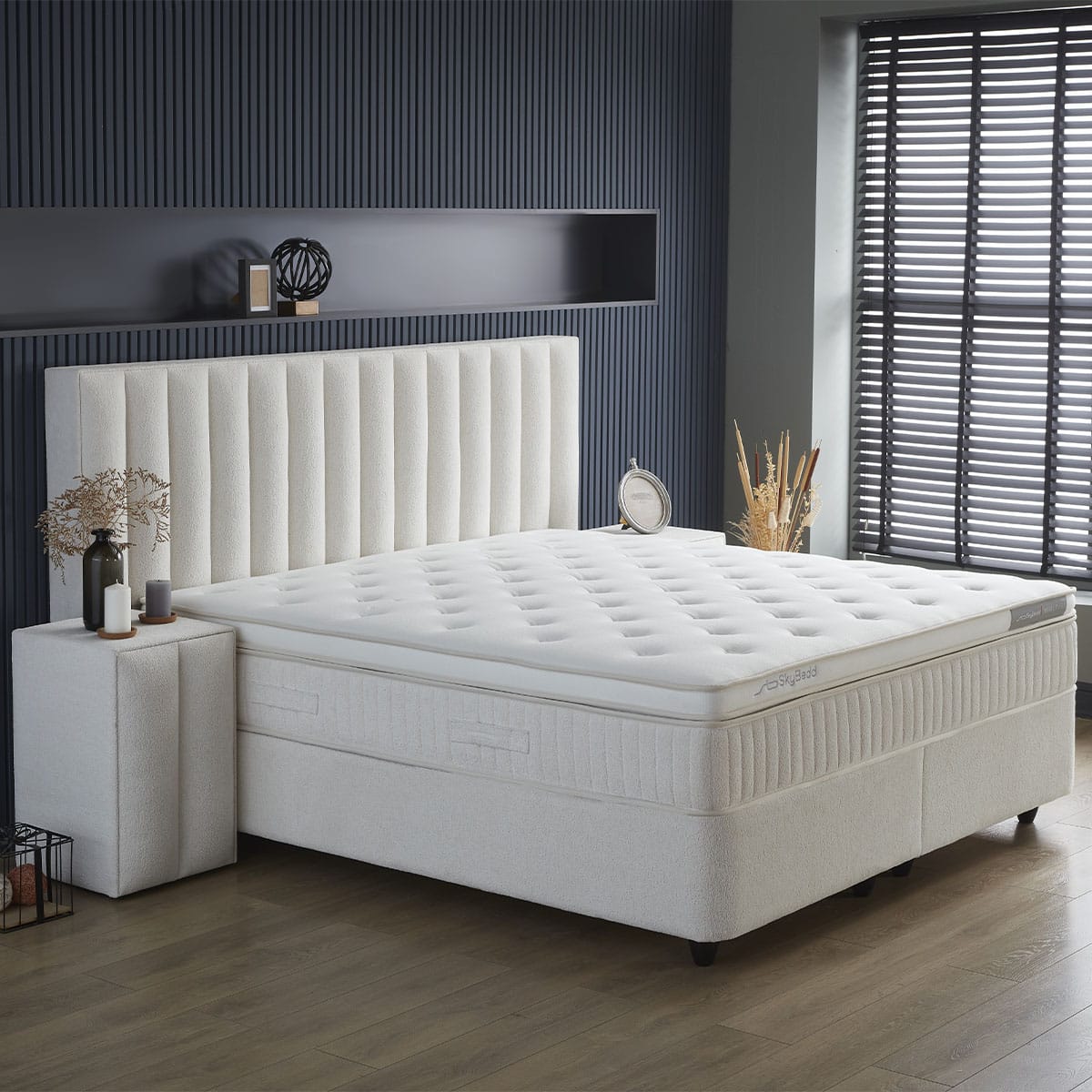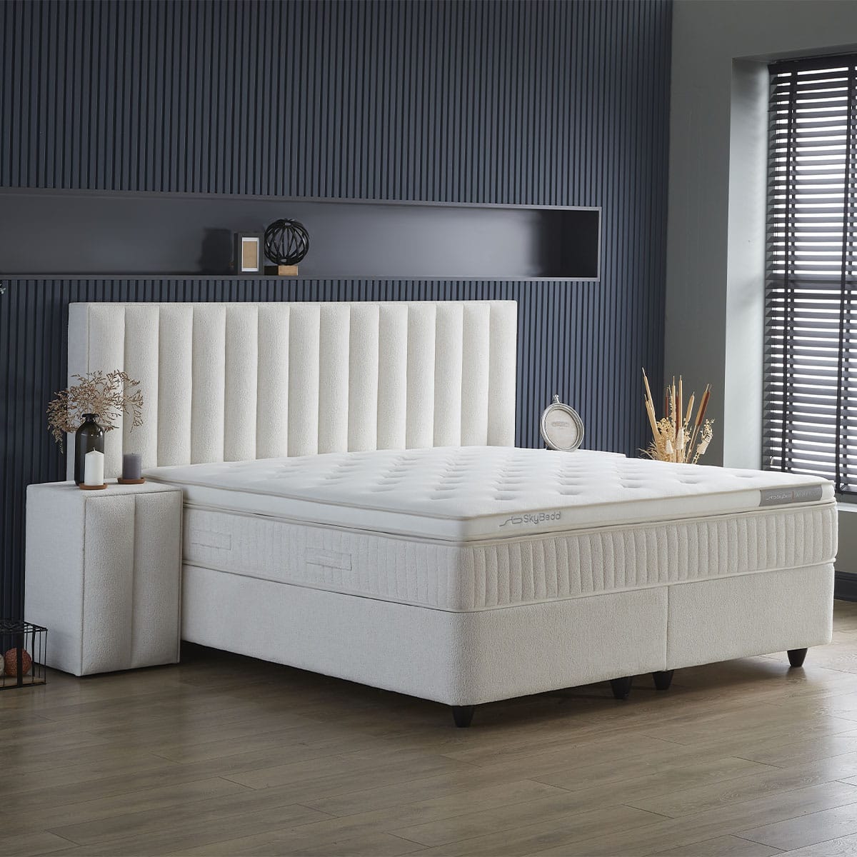 De Skybedd Woollybedd is een luxe boxspring die rust, functionaliteit en sfeervol design samenbrengt. Het verticale strokenhoofdbord in zachte bouclé-stof geeft het bed een warme Japandi-uitstraling. Onder het comfortabele hybride matras bevindt zich een ruime opbergbox die moeiteloos opent dankzij vier krachtige gasveren. Een stijlvolle en praktische keuze voor wie houdt van zachtheid, comfort en rust in de slaapkamer.