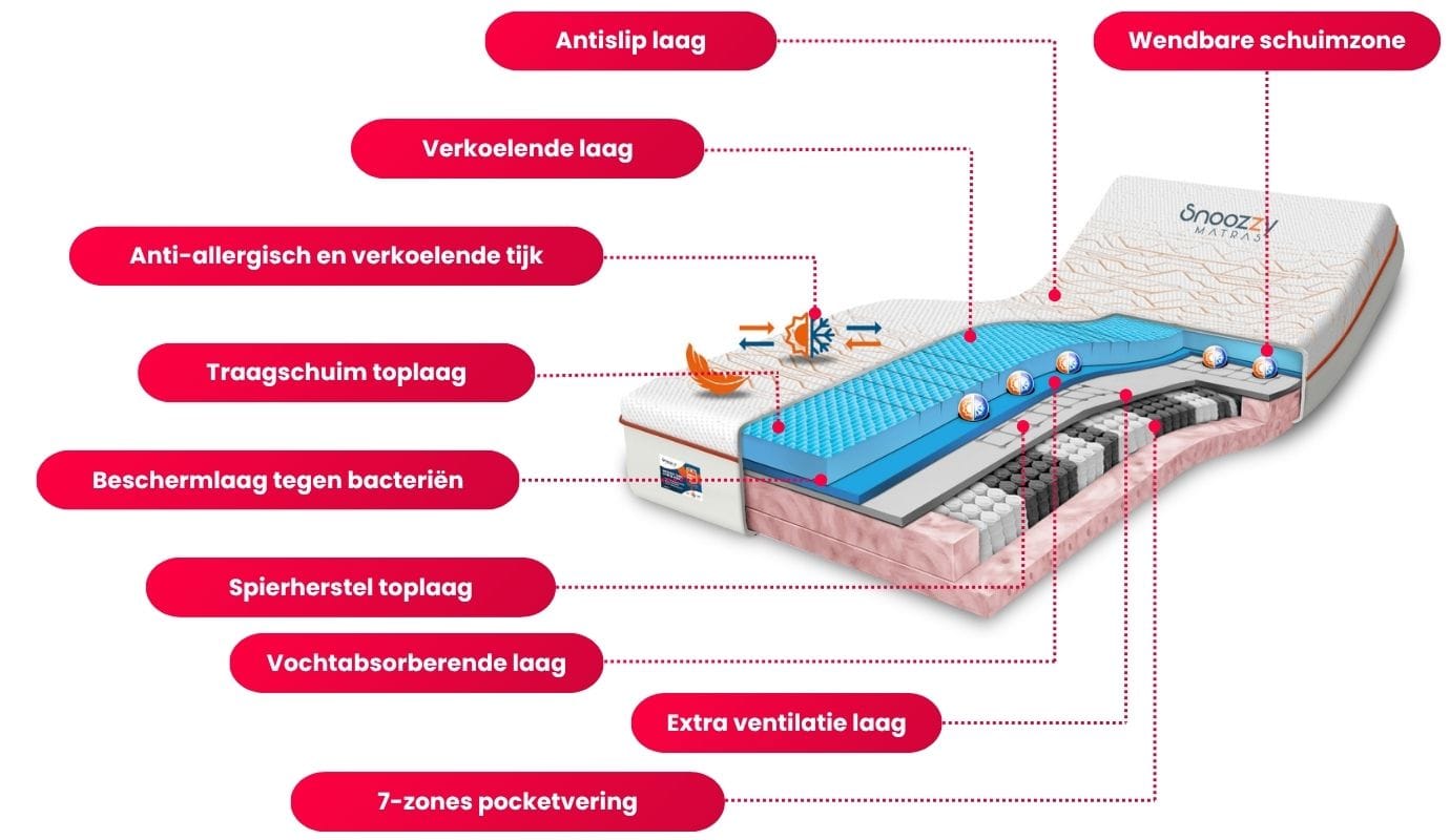 | Kern specificatie | Pocketvering, extra ventilatie lagen, bewegingsstimulerende schuimbalzones en traagschuim |
