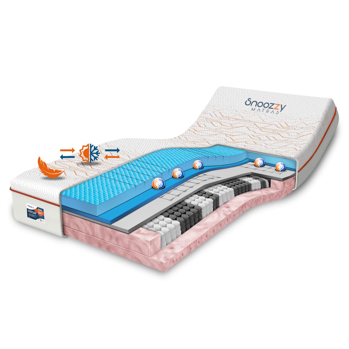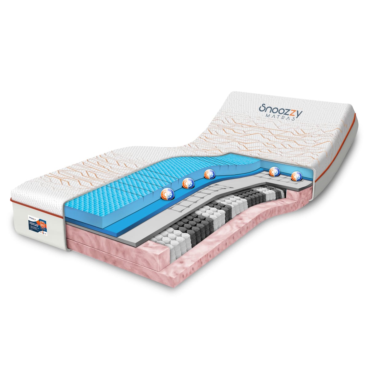 Het Snoozzy Cool Hybrid 8 matras is het topmodel in de Cool Hybrid serie en biedt ultiem slaapcomfort. Dit luxe matras combineert de voordelen van S-line pocketvering met premium visco-elastisch traagschuim, wat zorgt voor een perfecte balans tussen steun en comfort. De hybride opbouw van het matras biedt het beste van twee werelden: de S-line pocketvering kern zorgt voor gerichte ondersteuning en biedt uitstekende veerkracht, terwijl de schuimlagen bijdragen aan drukverlichting en optimale ventilatie voor een koel slaapklimaat.